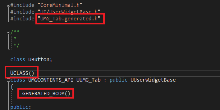 먼저 UMG_Tab이라는 클래스를 만들면 #include에 generated.h 라는 path가 보일 것이다. 그리고 동시에 UCLASS()도 볼 수 있다. 클래스를 만들면 항상 볼 수 있는 곳에 표시를 해두었다.