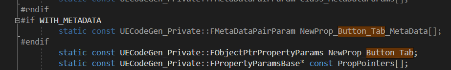 변수도 확인해봤다. 버튼클래스와 int32 자료형의 TabID를 UPROPERTY 매크로를 넣고 .generated.h/ .generated.cpp를 찾아 들어가봤다.