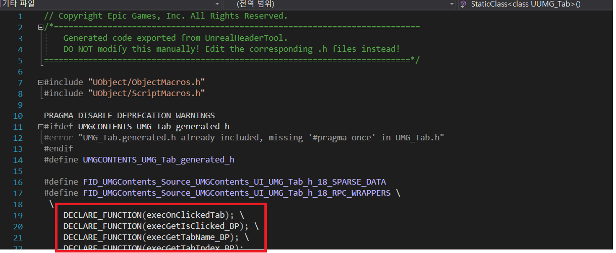 define이 상당히 많아서 엔진코드다. 라고 넘기려는데 익숙한 함수 이름이 보여서 확인해봤다. execOnClickedTab이라고 되어있는 저부분은 내가 실제 UMG_Tab.h 에 UFUNCTION으로 지정해둔 함수명이다.