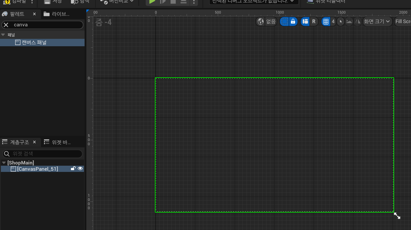 팔레트에서 canvas panel을 찾아서 계층구조의 ShopMain으로 드래그 드롭 해주면 이제 영역이 잡히면서 CanvaPanel_51이라는 제멋대로 이름을 하나 지어준다. 마음에 안들면 바꾸면 된다.