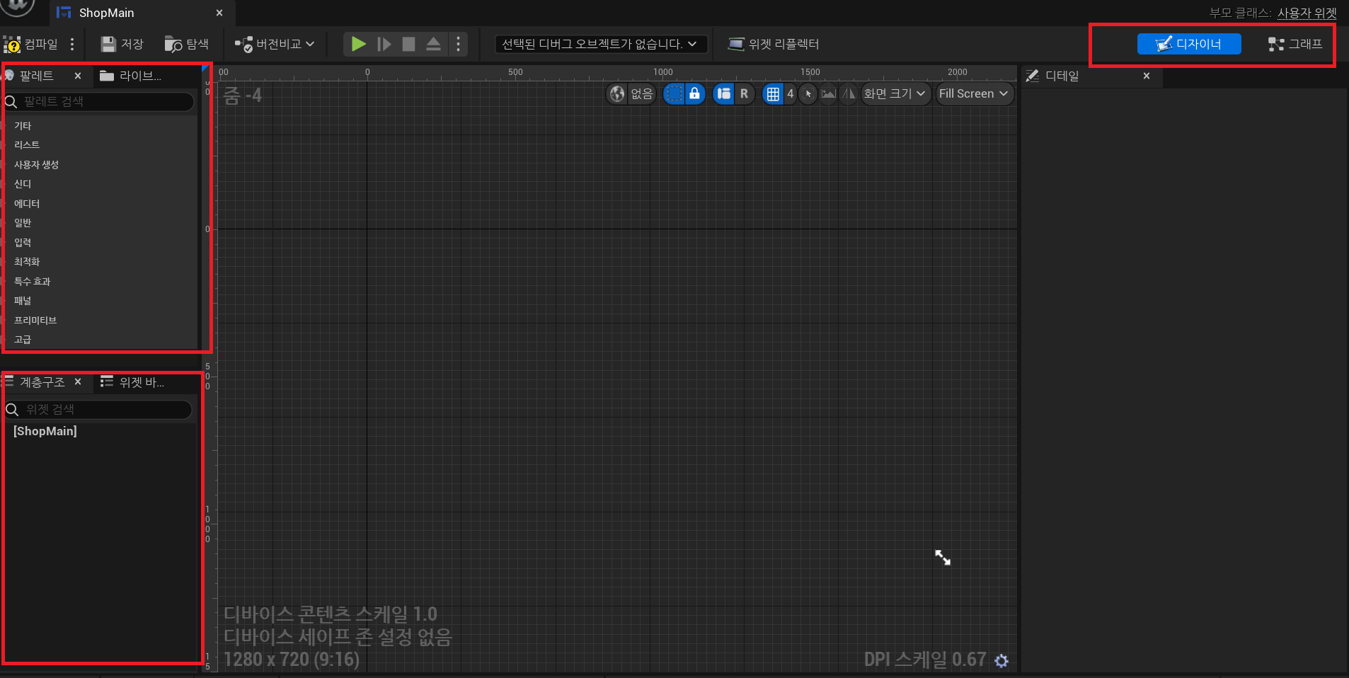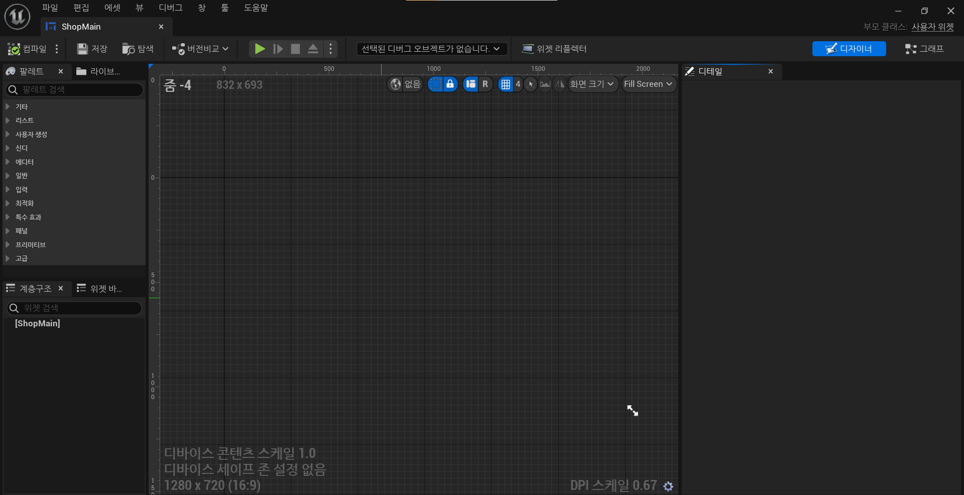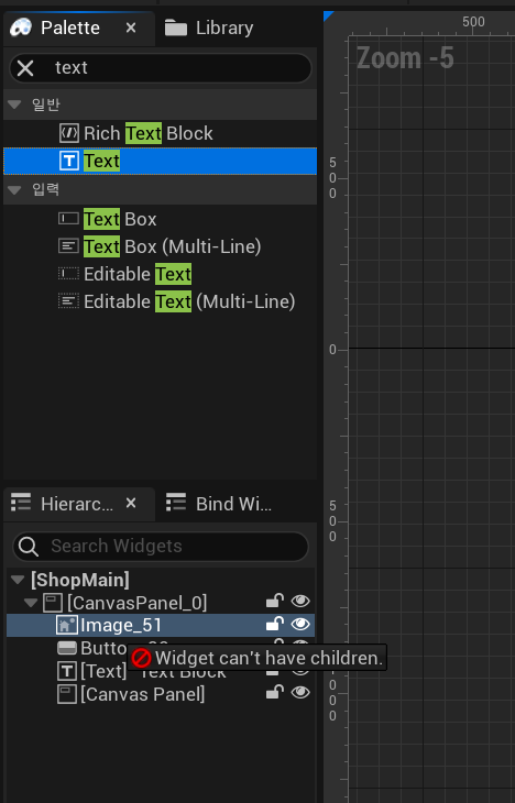 왼쪽의 팔레트 라는 곳에서 원하는 위젯 컴포넌트를 찾을 수 있고, 아래 계층구조 라고 되어있는 하이어라키에 드래그 앤 드롭으로 UI를 세팅할 수 있다. 현재는 자식을 가질 수 있는 메인 위젯이 아무것도 세팅되어있지 않기 때문에 자식을 가질 수 있는 위젯 중 용도에 알맞는 위젯을 골라 세팅해주어야 한다.