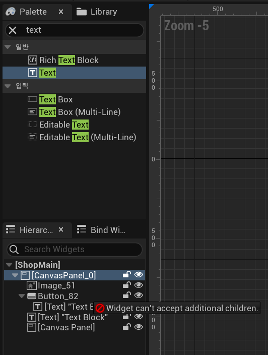 CanvasPanel이 자식을 가질 수 있는 위젯이라면 자식을 갖지 못하는 위젯도, 또 자식의 수에 제한이 있는 위젯들도 존재한다.