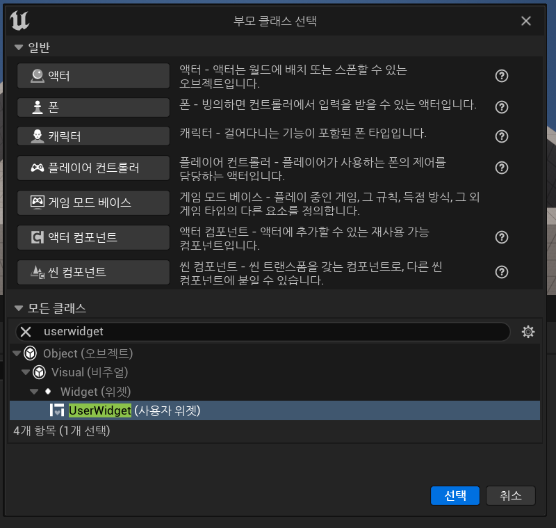 참고로 우클릭 - 블루프린트 클래스 를 눌러서 모든 클래스에서 userwidget을 찾기도 한다. 아래의 방법을 습관처럼 사용하고 있는데 방법은 다양하니 편한대로 쓰면 되지않을까?