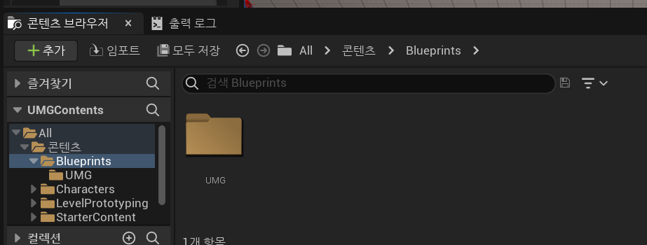 콘텐츠 브라우저에 스타터 패키지가 같이 있어서 따로 폴더를 만들고, UMG 라는 폴더를 하나 만들었다.