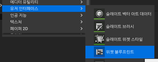 UMG 폴더로 들어가서 우클릭 후 유저 인터페이스 - 위젯 블루프린트를 클릭해서 위젯 블루프린트를 만들어야한다. 여기 안에서 이미지를 넣고 버튼을 넣으면서 UI 디자인을 할 수 있게된다.