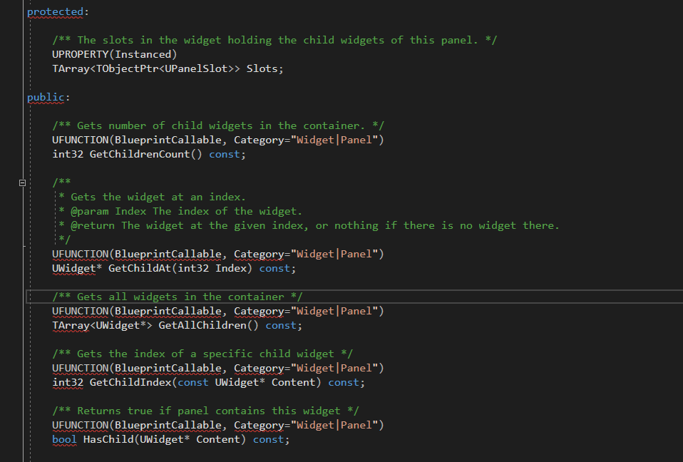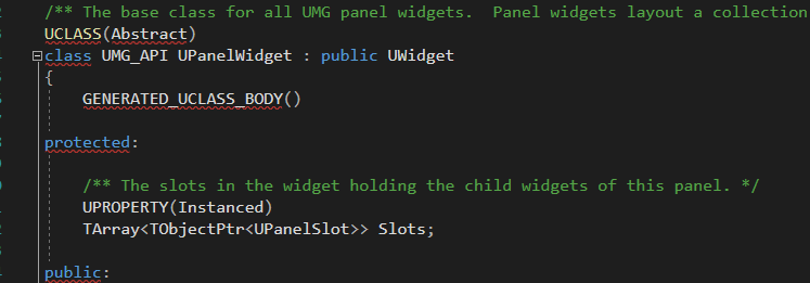 우선 UWidget은 UVisual 이라는 클래스를 상속받고 있다. UWidget 위에 부모클래스가 있는 이유는 슬레이트위젯을 컨트롤하지 않는 UI도 존재하기 때문이다. PanelSlot이 그 예가 되는데 이것도 추후 설명하도록 하겠다.