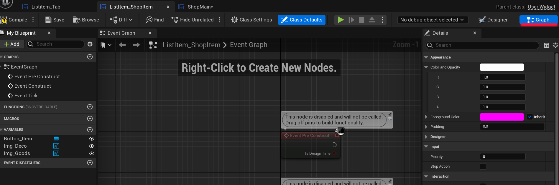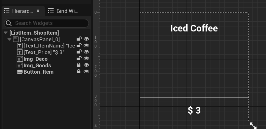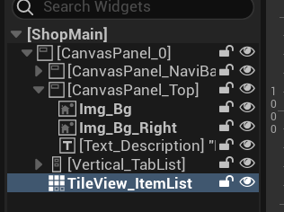 verticalBox에 내가 따로 만든 커스텀 위젯을 넣었다. 커스텀 위젯은 Shop위젯처럼 UUserWidget을 부모로하는 블루프린트를 하나 새롭게 만들었다. UUserWidget도 결국 UWidget을 상속받은 것이므로 Palette에서 가져올 수 있게 되어있다.