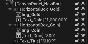 나는 계층구조를 각각의 역할이 필요한 순서대로 엮었다. 첫 번째는 가장 상단의 재화 표기 bar이다. Shop 이라는 현재 컨텐츠의 이름을 보여주고, 어떤 재화를 보여줄 것인지를 넣었다.