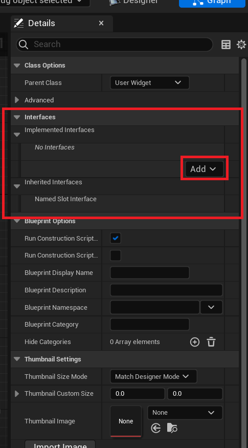 상단에 Class settings 라는 곳과 Class Defaults라는 곳이 있다. 현재 이 아이템을 타일뷰에서 사용할 수 있도록 해줄 예정이므로 Class Settings에서 인터페이스라는 것을 추가해주겠다.