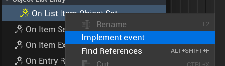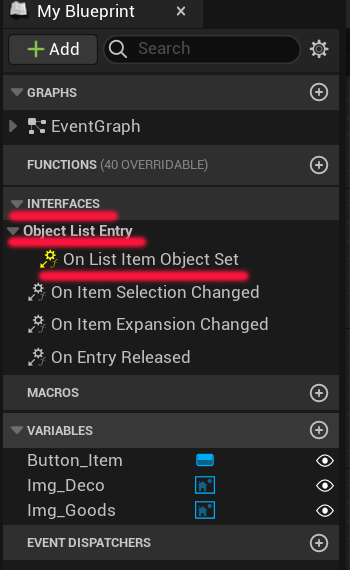 이렇게 추가하면 왼쪽 MyBlueprint아래에 인터페이스 관련된 항목들이 나열 된다. 여기서 ObjectListEntry에 들어가보면 OnListItemObjectSet 이라는 인터페이스가 생겨있을 것이다.