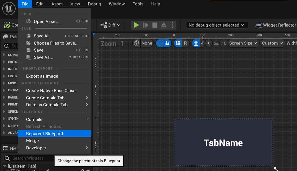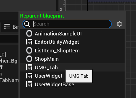 UMG 상단 bar에서 File - Reparent Blueprint 를 누르면 UUserWidget을 상속받은 클래스 목록이 뜬다. 그 중에서 현재 블루프린트의 부모로 지정해줄 클래스를 지정해주면 된다.