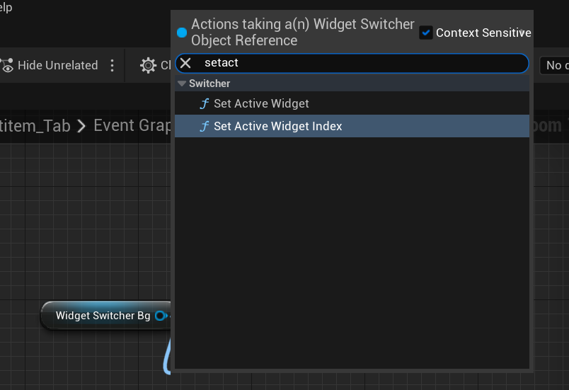 Get해온 WidgetSwitcherBg 오른쪽 핀을 끌어다 빈 곳에 놓으면 검색할 수 있는 창이 나온다.
