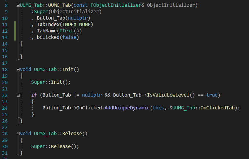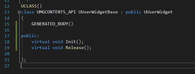 공통적으로 사용하게 될 함수로는 Init과 Release가 있고, 자식 클래스에서 재정의 할 수 있도록 virtual 키워드를 붙여주었다.