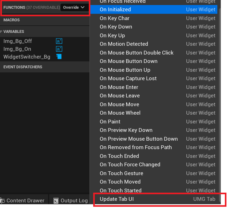 왼쪽 탭에서 Function 이라는 곳을 찾을 수 있을텐데 그 곳에 마우스를 가져다대면 override라는 버튼이 생길것이다. 그 override를 누르면 블루프린트에서 호출할 수 있는 함수를 쭉 보여준다. 우리는 UMG_Tab의 UpdateTabUI를 클릭해주자.