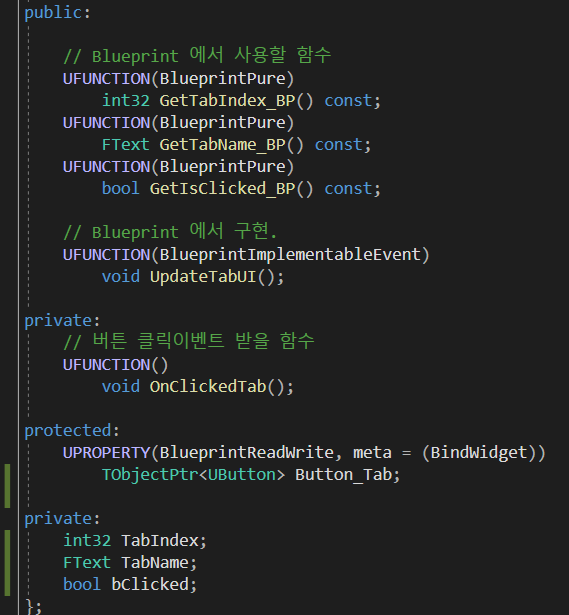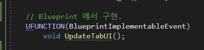 블루프린트에서 호출할 용도의 함수와 버튼 클릭 콜백을 받을 함수 등이 필요하다.