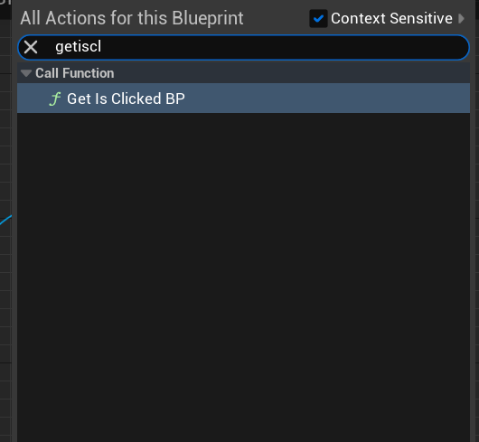 이번에는 빈곳을 우클릭해서 우리가 코드에서 만들었던, BlueprintPure라는 지정자를 넣었던 함수 중 GetIsClickedBP라는 함수를 찾아온다.