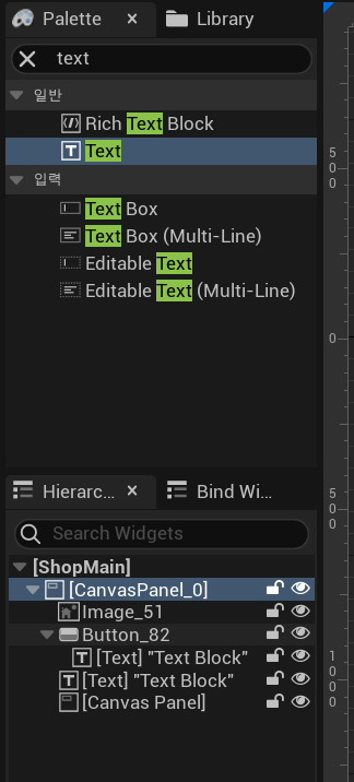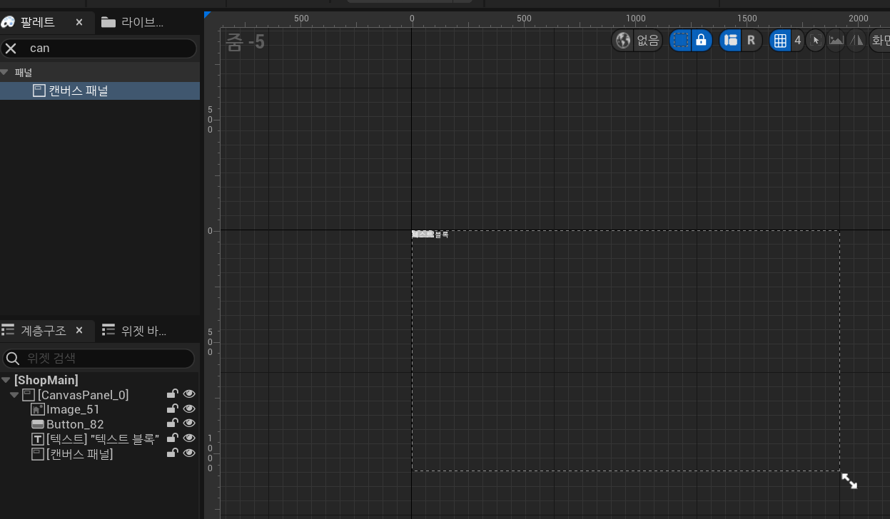 팔레트에서 canvas panel을 찾아서 계층구조의 ShopMain으로 드래그 드롭 해주면 이제 영역이 잡히면서 CanvaPanel_51이라는 제멋대로 이름을 하나 지어준다. 마음에 안들면 바꾸면 된다.