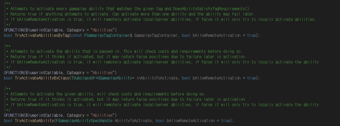 UAbilitySystemComponent 클래스에 아래의 함수들이 있다.