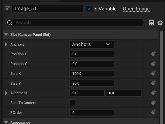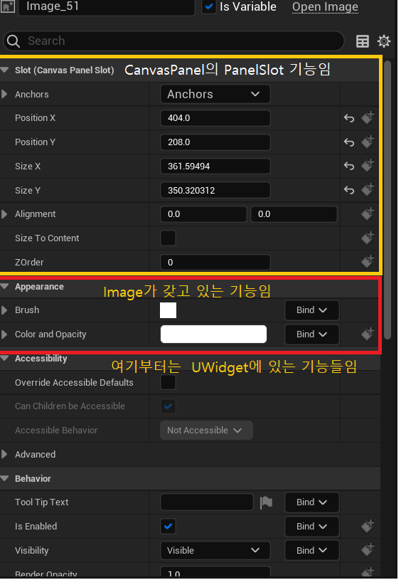 이렇게 넣으면 Image의 Slot에는 앵커, Position, Size, Alignment Zorder 등등의 설정이 가능한 CanvasPanelSlot의 속성을 변경할 수 있을 것이고,