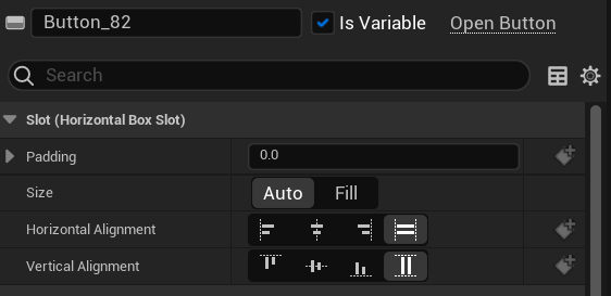 버튼의 Slot에는 HorizontalBoxSlot 의 설정을 변경할 수 있는 세팅이 나올 것이다. HorizontalBoxSlot은 패딩값, size 세팅 ,정렬방식 등의 속성을 갖고 있다.