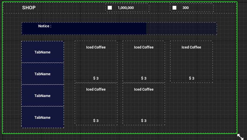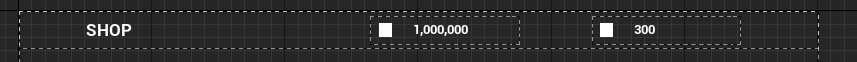 나는 계층구조를 각각의 역할이 필요한 순서대로 엮었다. 첫 번째는 가장 상단의 재화 표기 bar이다. Shop 이라는 현재 컨텐츠의 이름을 보여주고, 어떤 재화를 보여줄 것인지를 넣었다.