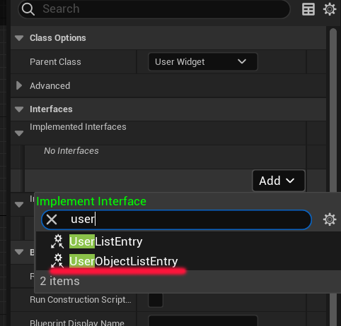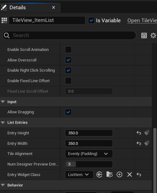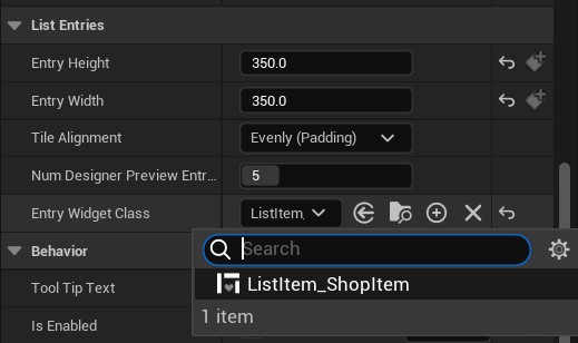 EntryWidgetClass 라는 것을 설정하도록 되어있다. 이걸 위해서 따로 UserWidget으로 아이템을 만들고, 그 내부에서 몇 가지 세팅을 해주어야한다.
